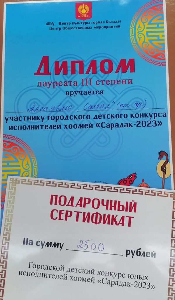 29 апреля прошел городской детский конкурс исполнителей хоомей «Сарадак-2023». Наши учащиеся активно приняли участие. Результаты: старшая группа «Салгал» — лауреаты 3 степени, младшая группа — дипломанты 3 степени, в индивидуальном конкурсе Ооржак Тумен-Байыр — лауреат 1 степени, Бегзи Кудер — лауреат 3 степени.