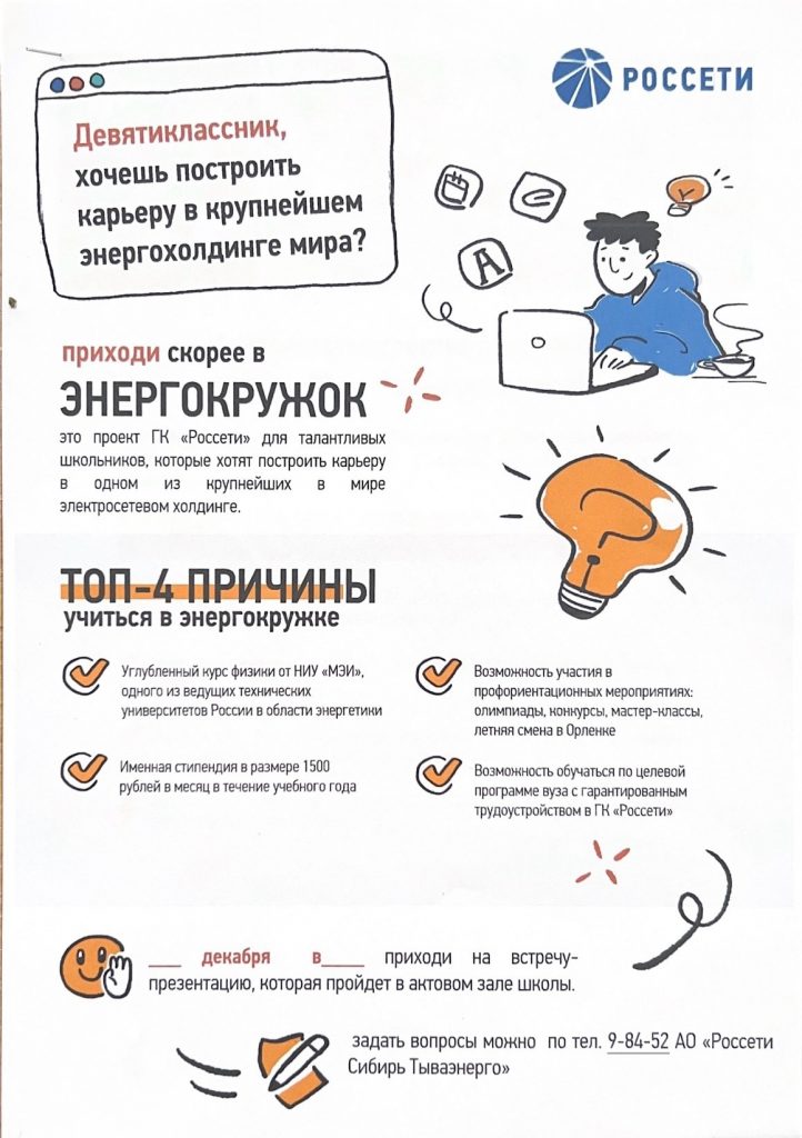 Объявления Приглашаем 9-классников в Энергокружок Приходи скорее в Энергокружок. Приглашаем наших девятиклассников записаться на энергокружок до 13 января с 9.00ч до 13.00ч в 208 каб к Моисееву Александру Павловичу.