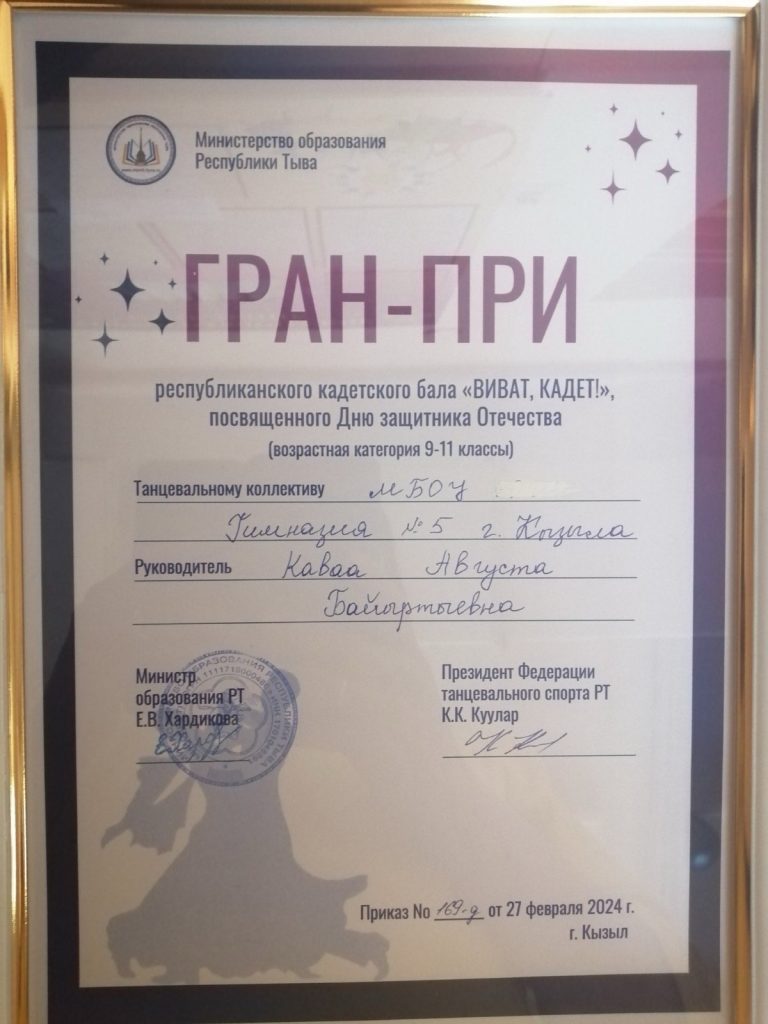 Наши кадеты 10 класса вместе с руководителем, хореографом Каваа Августой Байыртыевной завоевали Гран-При на Республиканском кадетский бал «Виват, кадет!», посвященный Дню защитника Отечества.