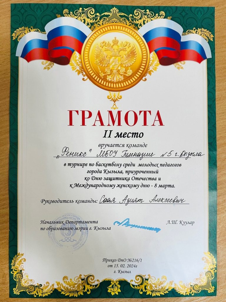 Департамент по образованию Мэрии города Кызыла провели соревнование по баскетболу среди молодых учителей школ города Кызыла. Приняли участие 4 команды и наша команда в составе Азиата Алексеевича (физкультура), Алдынай Артемовна (физика), Аяна Орлановна (английский язык), Хуреш Родионович (начальные классы), Айрана Орлановна (русский язык), Долаана Сергеевна (физкультура) заняли 2 место. Поздравляем! Учитель физики Алдынай Артемовна стала лучшим игроком. Молодец!