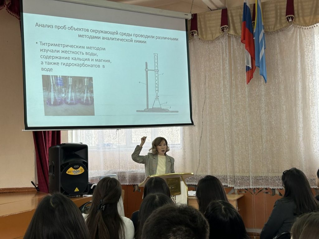 В рамках лекторского десанта Русского географического общества для учащихся биолого-химического 11 б класса классный час на тему «Методы химического анализа в мониторинг окружающей среды» провела доцент кафедры химии ТувГУ, кандидат химических наук, член РГО Урана Владимировна Ондар.