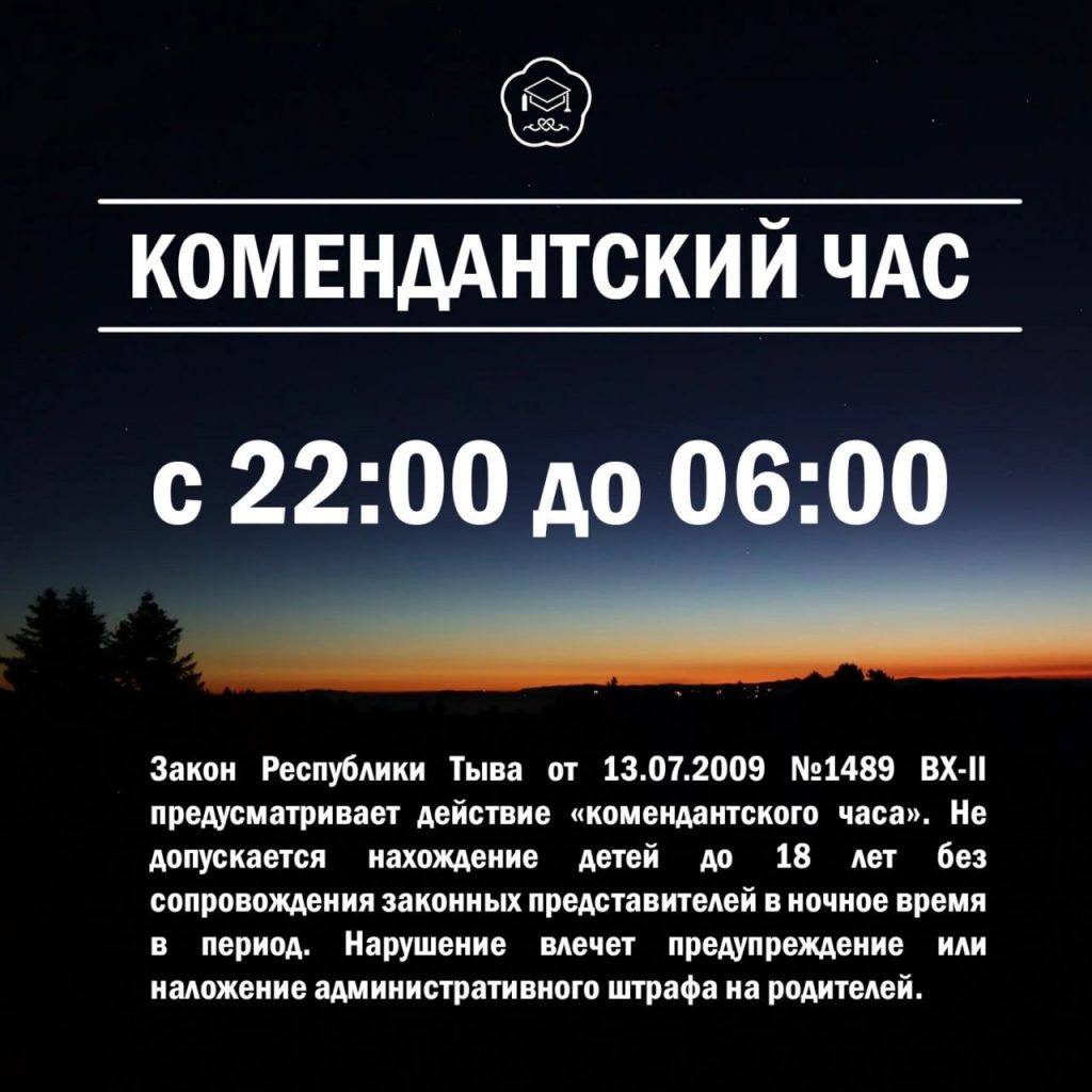 ️В соответствии с законом Республики Тыва от 13.07.2019 г. №1489-ЗРТ «О мерах по предупреждению вреда физическому и нравственному развитию детей в республике Тыва» с 22.00 до 06.00 чч. несовершеннолетним НЕЛЬЗЯ НАХОДИТЬСЯ в общественных местах без сопровождения родителей или иных законных представителей!