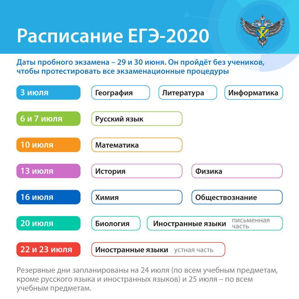 3 августа пройдёт ЕГЭ по географии, литературе, информатике, биологии, истории и устной части экзамена по иностранным языкам, 5 августа – ЕГЭ по русскому языку, 7 августа – по обществознанию, химии, физике, профильной математике и письменной части ЕГЭ по иностранным языкам. 8 августа в расписании предусмотрен резервный день для сдачи экзаменов по всем предметам.