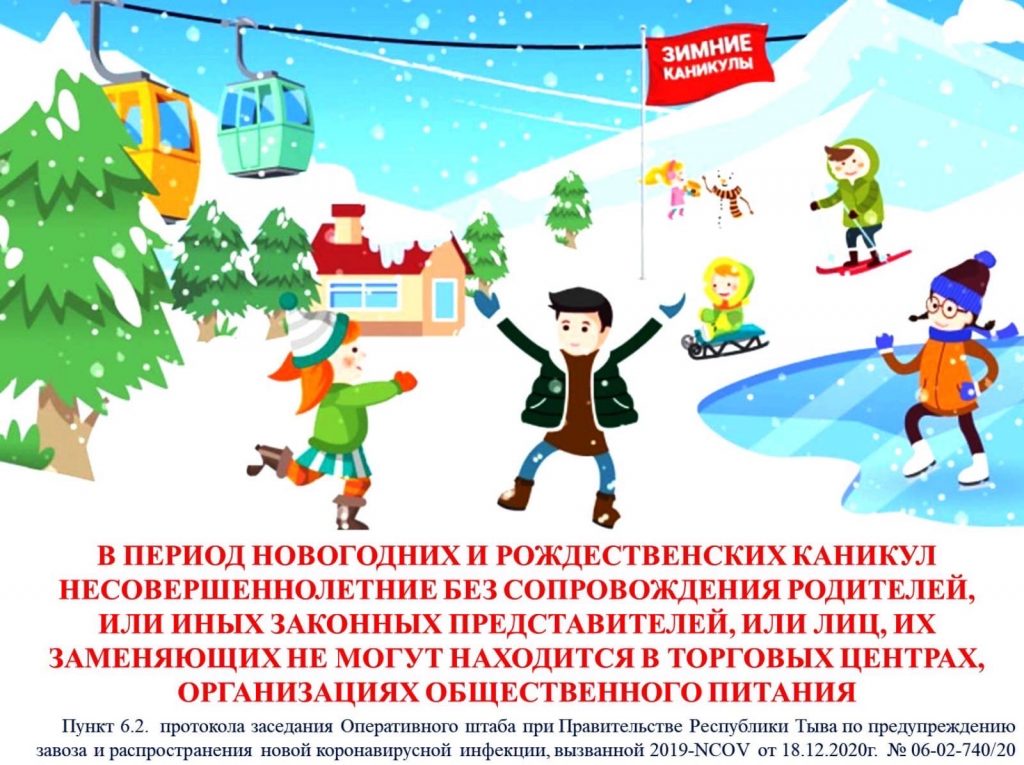 Во исполнение пункта 6.2. протокола заседания Оперативного штаба при Правительстве Республики Тыва по предупреждению завоза и распространения новой коронавирусной инфекции, вызванной 2019-NCOV от 18.12.2020г. № 06-02-740/20 В ПЕРИОД НОВОГОДНИХ И РОЖДЕСТВЕНСКИХ КАНИКУЛ НЕСОВЕРШЕННОЛЕТНИЕ БЕЗ СОПРОВОЖДЕНИЯ РОДИТЕЛЕЙ, ИЛИ ИНЫХ ЗАКОННЫХ ПРЕДСТАВИТЕЛЕЙ, ИЛИ ЛИЦ, ИХ ЗАМЕНЯЮЩИХ НЕ МОГУТ НАХОДИТСЯ В ТОРГОВЫХ ЦЕНТРАХ, ОРГАНИЗАЦИЯХ ОБЩЕСТВЕННОГО ПИТАНИЯ!