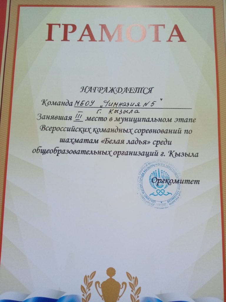 Наша команда по шахматам заняли 3 место в муниципальном этапе Всероссийских командных соревнований по шахматам «Белая ладья» среди школ г.Кызыла. В составе команды Аюш 8 «А», Саюди 7 «Е», Рагчаасурэн 6 «Ж», Валерия 5 «М». Руководитель Нурзат П.И. Поздравляем! Молодцы!