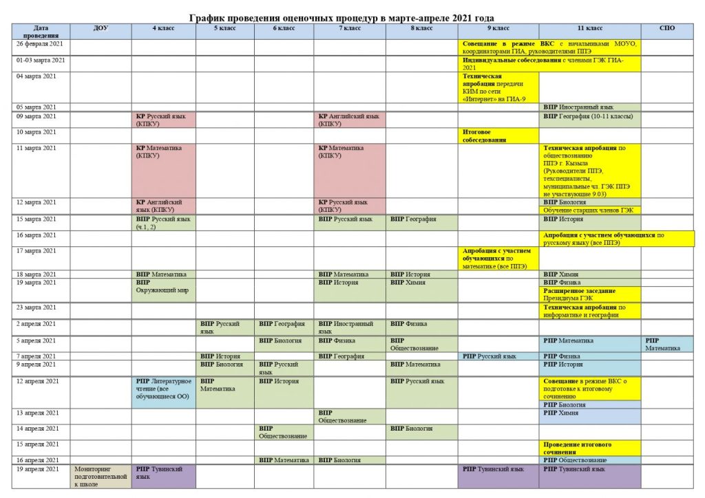 ВПР пройдут для обучающихся 4-8 классов в штатном режиме, для обучающихся 11 классов – по решению школы. Конкретные даты проведения ВПР для каждого класса и предмета школы определят самостоятельно в рамках установленного расписанием периода. Начнется проведение ВПР в 2021 году с проверочных работ для 11 классов. Они пройдут по истории, биологии, географии, физике, химии и иностранным языкам (английскому, немецкому или французскому) в период с 1 по 26 марта. ВПР по географии школы могут провести для 11 или 10 классов в зависимости от своего учебного плана. С 15 марта по 21 мая пройдут ВПР для 4 классов (по русскому языку, математике и окружающему миру), 5 классов (русский язык, математика, история, биология), 6 и 8 классов (русский язык и математика), 7 классов (русский язык, математика, история, биология, география, обществознание, физика). Эти проверочные работы пройдут для всех классов в параллели. Также в обязательном порядке все семиклассники напишут с 1 апреля по 21 мая ВПР по иностранному языку (английскому, немецкому или французскому). Обучающиеся 6 и 8 классов с 15 марта по 21 мая напишут ВПР еще по двум предметам на основе случайного выбора. Шестиклассникам могут встретиться ВПР по истории, биологии, географии или обществознанию, восьмиклассникам – по истории, биологии, географии, обществознанию, химии или физике.