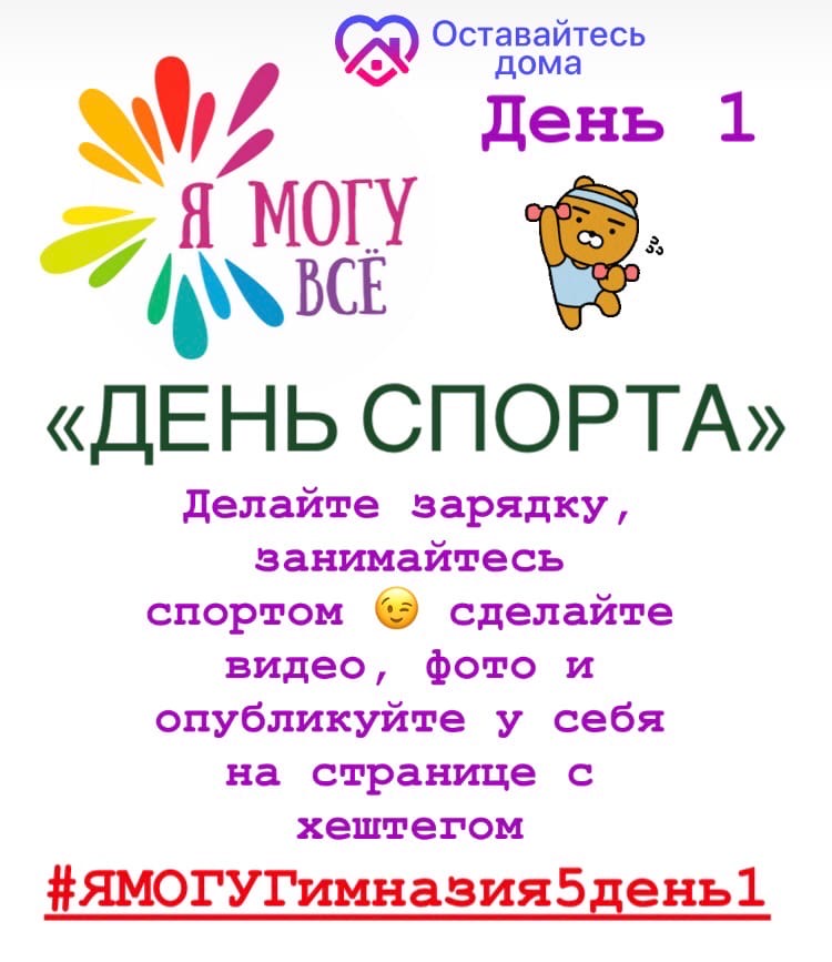 Ловите задание 1 дня нашего марафона «Я Могу…». Завтра начинаем опубликовывать фото/видео как вы занимаетесь спортом дома и оставляем хештег #ЯМОГУГимназия5день1