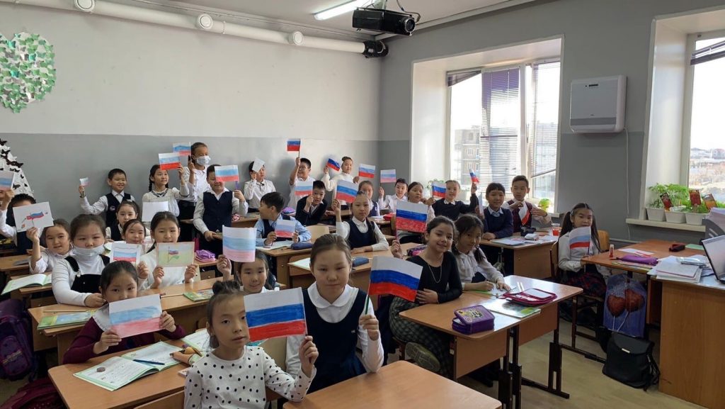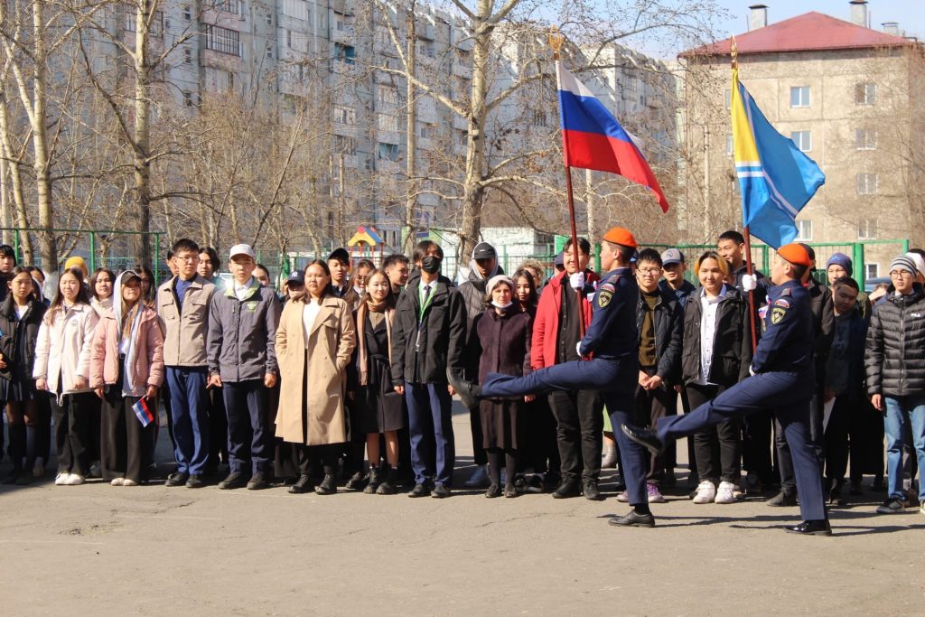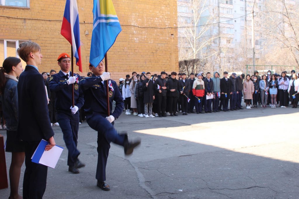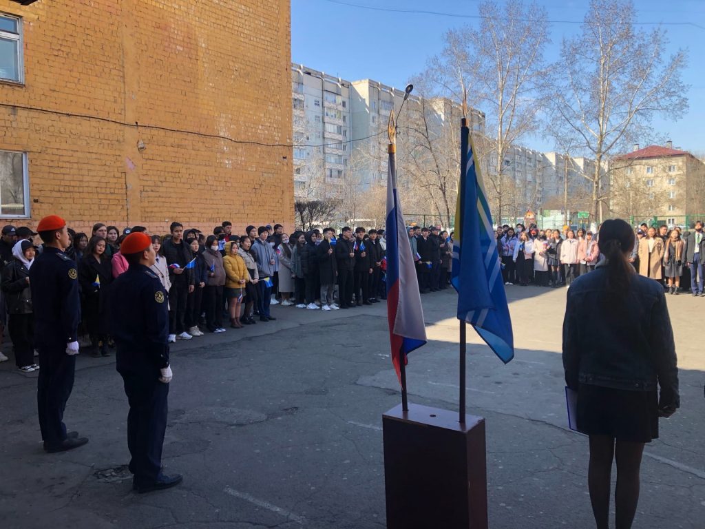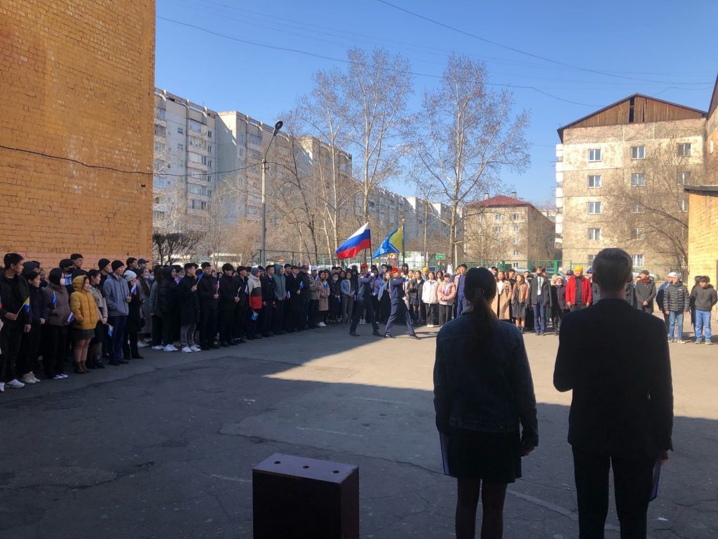 25 апреля в 10.00ч в Гимназии №5 состоялось торжественное поднятие флагов России и Тувы. На церемонии участвовали учащиеся 10-11х классов и педагоги. Исполнили гимны РФ и РТ. Поднятие государственного флага — это особый торжественный ритуал. На данном мероприятии вручили грамоты победителям в соревнованиях по волейболу и настольному теннису. Учащиеся начальных классов провели 5минутки с исполнением гимна России