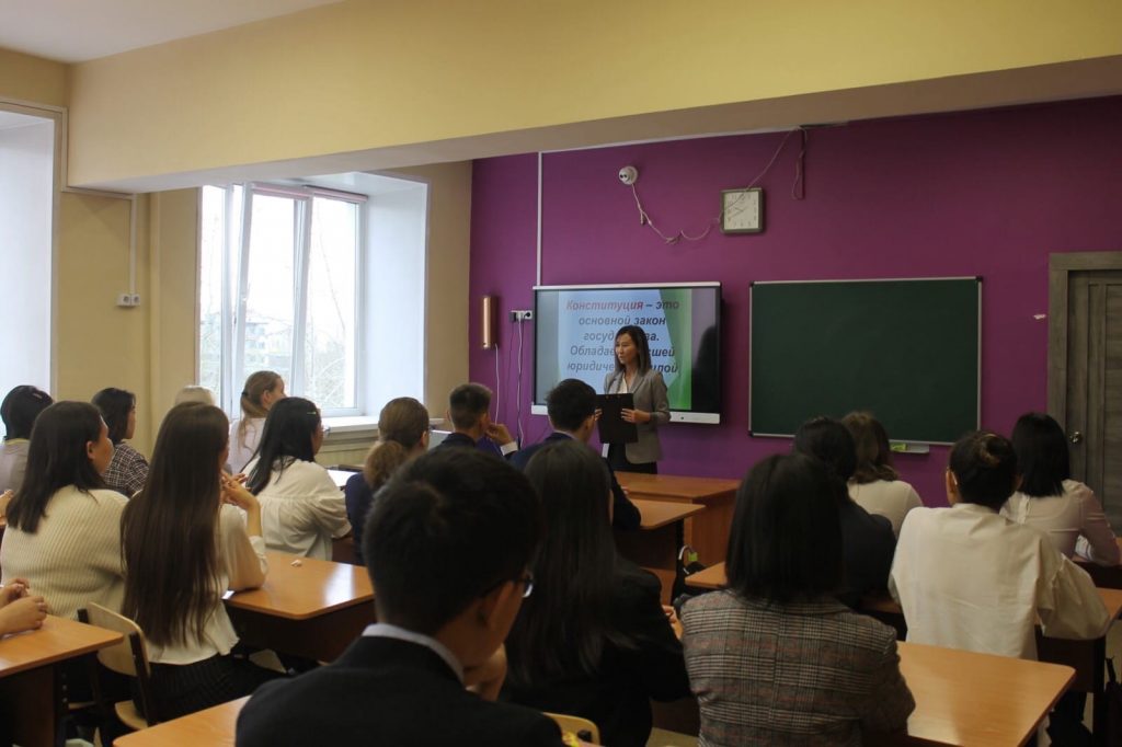 В 10 «А» классе учитель истории и обществознания Саая А.В. провела урок , посвящённый Конституции Республики Тыва. 6 мая 2001 года, 21 год назад была принята Конституция Республики Тыва. В истории нашей республики нынешняя Конституция не является первой. Первая Конституция была принята еще 101 год назад. Учащимися 10 класса были исполнены Гимны РФ, РТ