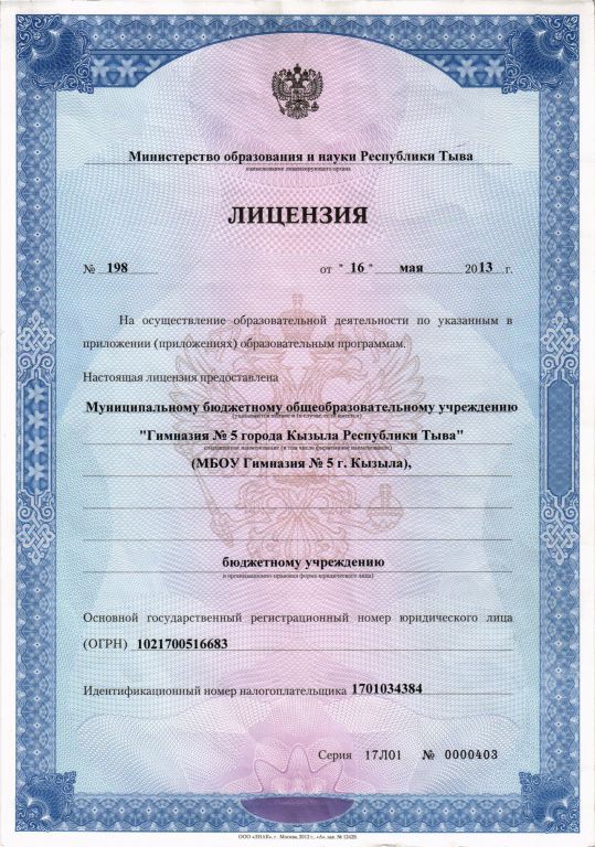 В МБОУ Гимназии №5 г. Кызыла РТ реализуются основные программы: программы начального общего образования, основного общего образования, среднего общего образования программы различных направлений: научно-технического, физкультурно-спортивного, художественно-эстетического, эколого-биологического, военно-патриотического, культурологического и естественнонаучного, а также программы, обеспечивающие дополнительную (углубленную) подготовку обучающихся по предметам физико-математического, гуманитарно-лингвистического и естественнонаучного профилей. В гимназии ведется углубленное изучение таких предметов как математика, русский язык, иностранный язык, физика, химия, биология, информатика, история, география. Учащиеся 7-9 классов обучаются по предпрофильной подготовке физика-математического и лингвистического направлений. Учащиеся 11 классов обучаются в гуманитарном, социально-экономическом, естественнонаучном, технологическом (направленность оборонно-спортивная и информационно-технологическая).
